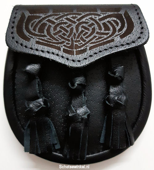 Sporran, Zwart, leer, celtic, pin, 3 tassels